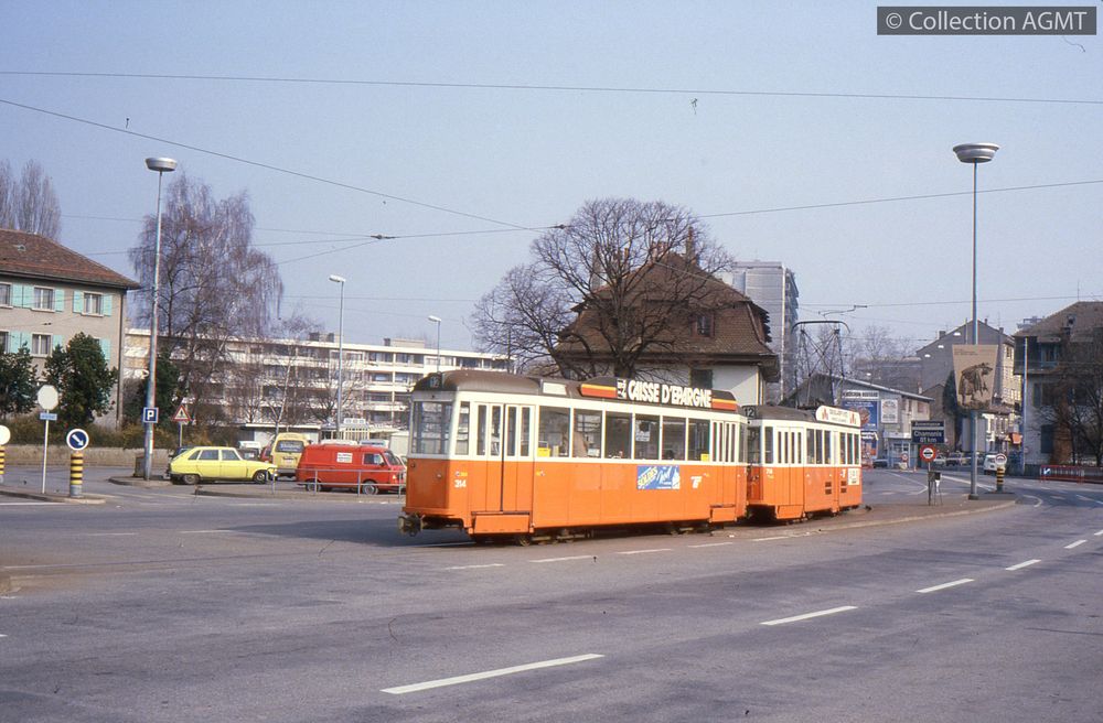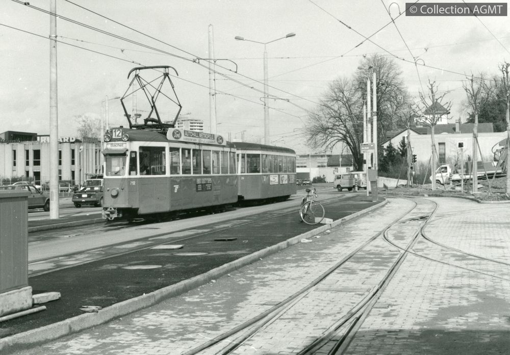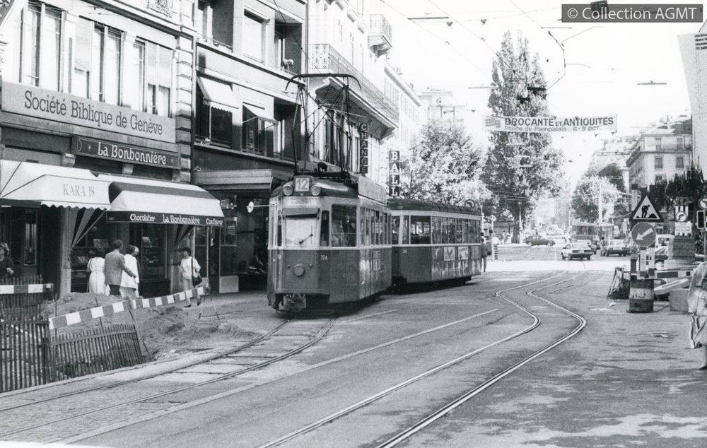 PermalinkEn service sur la ligne 12 à destination du Bachet, un convoi TPG formé de l'automotrice 712 et de la remorque 314, marque l'arrêt "De Staël" / Jeremy Wiseman