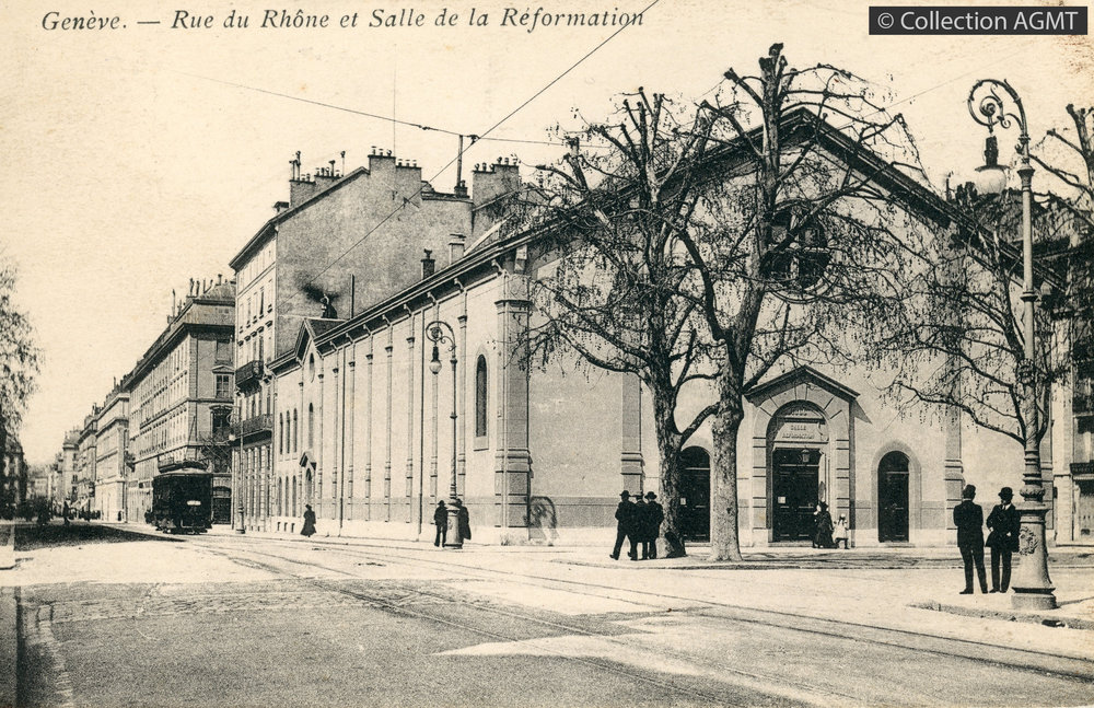 Genève : rue du Rhône et Salle de la Réformation [document graphique à deux dimensions] . - Genève : Comptoir artistique, [ca 1908] . - 1 carte postale : noir et blanc ; 9 x 14 cm. - (Comptoir artistique; 206) . Langues : Français (fre)