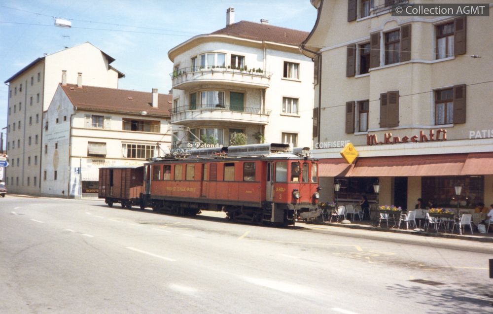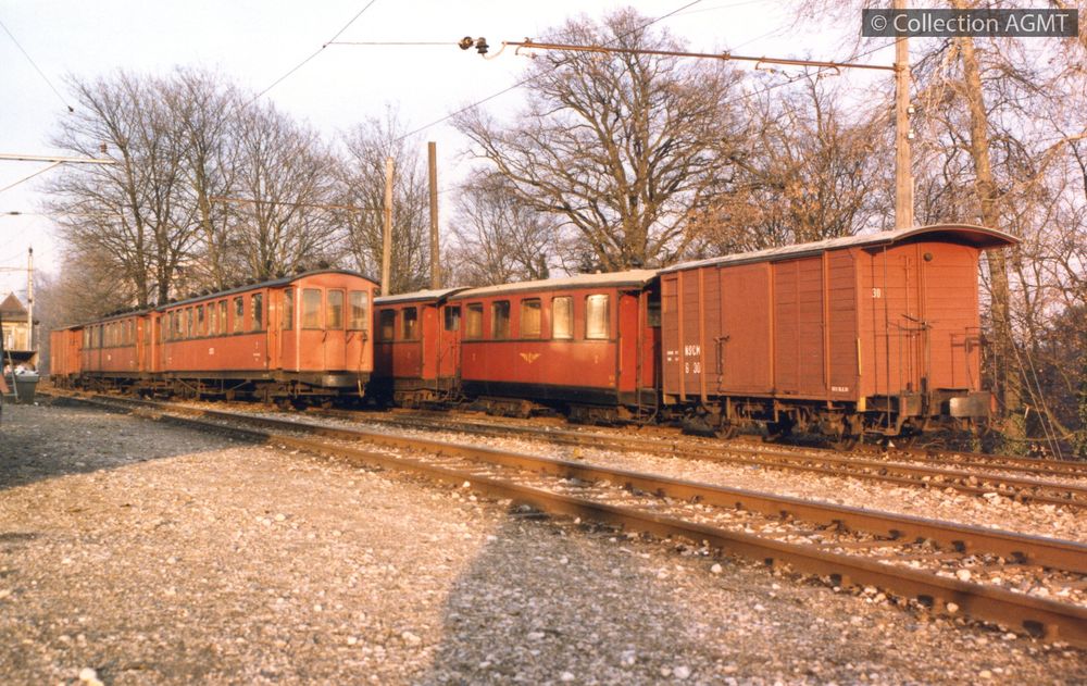 [Année] 1911-2000Résumé : L'automotrice BCFe 4/4 22, livrée au chemin de fer de la Bernina (BB) en 1911, y assura son service sans modification notable jusqu'en 1953. Cette année-là, elle fut profondément transformée pour pouvoir circuler également sur la ligne Coire - Arosa. Dépourvue de son compartiment fourgon, elle fut remise en service sous la nouvelle désignation de BCe 4/4 30. Lors de sa révision générale en 2000, elle a perdu la livrée rouge RhB qu'elle arborait depuis 1966, pour retrouver sa livrée d'origine. PermalinkCirculant en direction de La Cure, un convoi mixte du NStCM mené par l'automotrice ABDe 4/4 1 quitte la gare du Muids / Jeremy Wiseman
