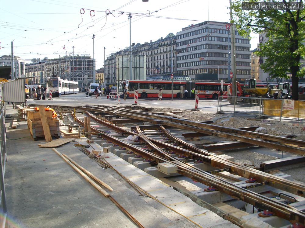 PermalinkEn service sur la ligne 12 à destination du Bachet, un convoi TPG mené par l'automotrice 825 marque l'arrêt au rond-point de Plainpalais / Richard J.S. Wiseman