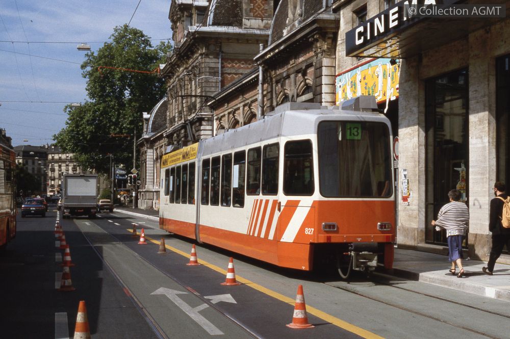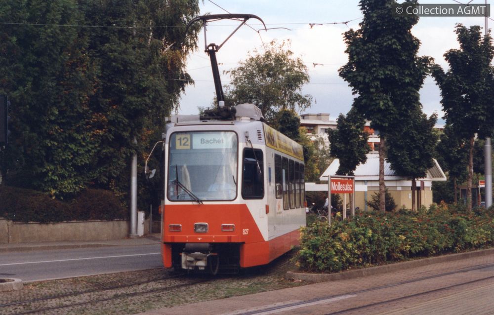 3141(494.42)_TPG_1989-07_d.jpgImage JpegEn service sur la ligne 12 à destination du Bachet, l'automotrice Be 4/6 827 des TPG quitte la boucle de rebroussement du terminus de Moillesulaz / Gaston Guignard