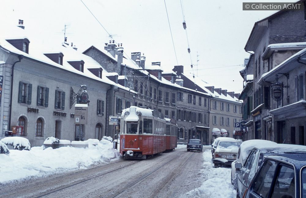 PermalinkUn convoi TPG de la ligne 12 à destination de Moillesulaz, mené par l'automotrice 702, circule à la rue Ancienne à Carouge après une importante chute de neige / Richard J.S. Wiseman