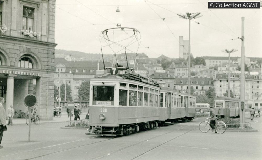 3141(494.34)_StStZ_1948-05.jpgImage JpegUn convoi VBZ de la ligne 7 à destination de Wollishofen, formé de l'automotrice 1338 et de deux remorques, arrive à la Bahnhofplatz / Jeremy Wiseman
