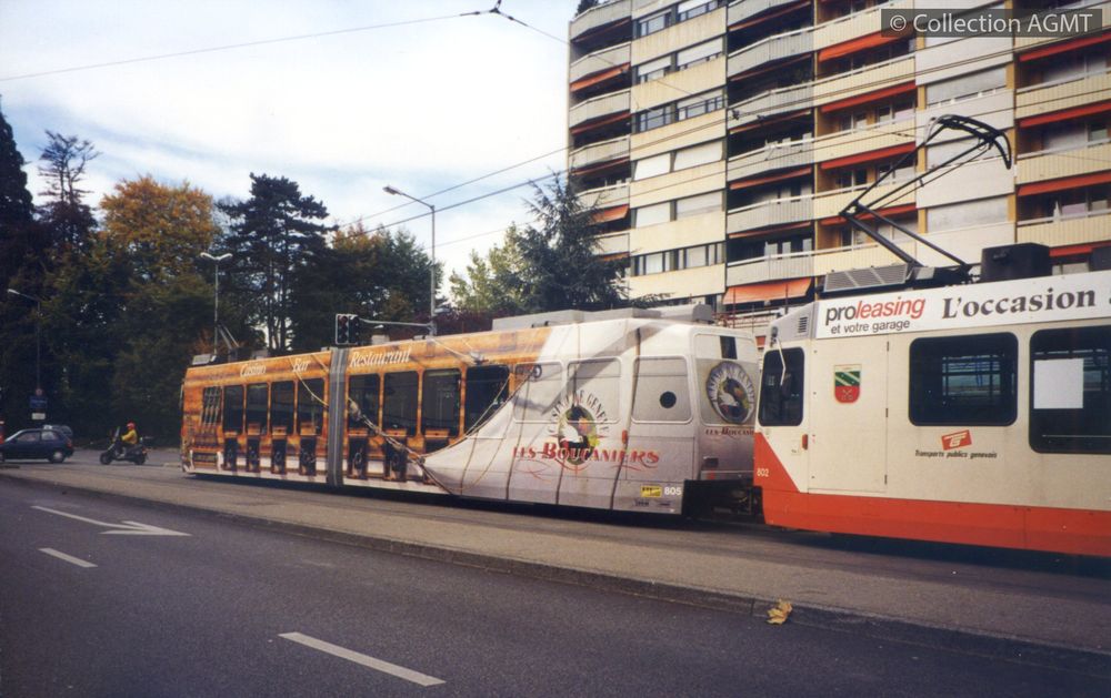 Affiner la recherche Interroger des sources externesEn service sur la ligne 12 à destination du Bachet, un convoi TPG mené par l'automotrice Be 4/6 805 en livrée publicitaire "Les boucaniers", marque l'arrêt "François-Jacquier" / Gaston Guignard