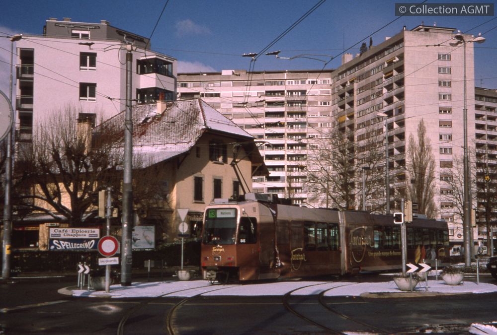 PermalinkPermalinkEn service sur la ligne 13 à destination des Nations, l'automotrice 845 en livrée publicitaire "Favarger" traverse le rond-point de la route de St-Julien aux Palettes / Jean-Marc Bongni